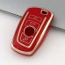 A stylish and practical TPU car key cover designed for BMW F-series, 4 button keys. This cover provides excellent protection against scratches, dust, and dirt. Made from high-quality, flexible TPU material, it ensures durability and a premium look. The red color with gold trim adds a touch of elegance, making it the perfect accessory for your car key.